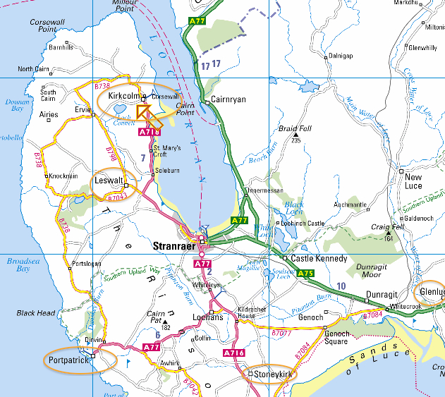 The principal settlements are Stranraer at the head of Loch Ryan and the small village of Portpatrick on the west coast, other villages are dotted up and down the peninsula, including Kirkcolm, Leswalt, Lochans, and in the South Rhins; Stoneykirk, Sandhead, Ardwell and Drummore. (see #42-DNA-3 for description of the Rhins)
