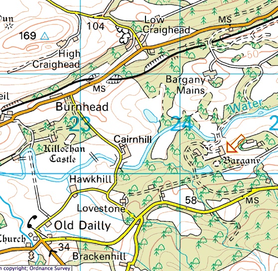 Old Daily is a small village with a few houses still standing and the ruins of a 14th century church. The churchyard has the graves of five Covenanters although eight. One of these is John Semple of Eldington who was shot in April 1685 by Jacobean soldiers for harbouring Covenanters, after a tip-off from Alexander Fergusson of Kilkerran. Old Dailly church is built on the site of an earlier Celtic chapel dating around 1236. The church is the burial ground of the Dalrymple Hamilton family of Bargany, the Cathcarts of Killochan and the Boyds of Penkill.